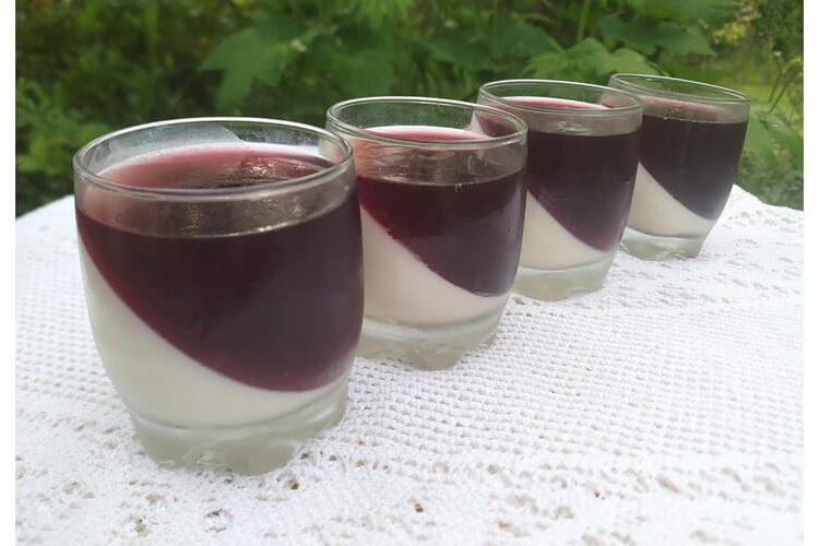 Finish assembling the glasses. Once the white mixture has set well, stand the glasses upright and pour the cold hibiscus mixture on top. Return to the refrigerator for 1-2 hours. Serve the panna cottas chilled.