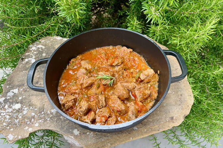 Preparation of the ingredients Sauté the pieces of veal in olive oil on each side, then add the onion. Mix well, add the peppers, and continue cooking for 3 minutes.