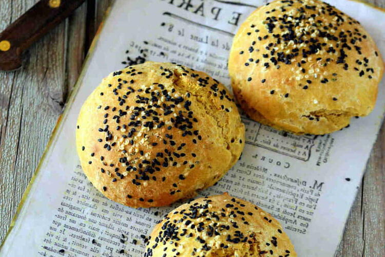 Preheat your oven to 200°C. In a small bowl, mix 2 teaspoons of olive oil and 1 tablespoon of plant-based milk. Using a brush, glaze the burgers with this mixture and sprinkle with hemp seeds and black sesame seeds.