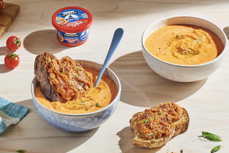 A delicious recipe for sunny vegetable gazpacho, toasted bread, and tuna spread.