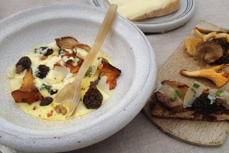 Recipe for Velouté with aged sheep’s cheese and yellow wine, sautéed chanterelles and morels.