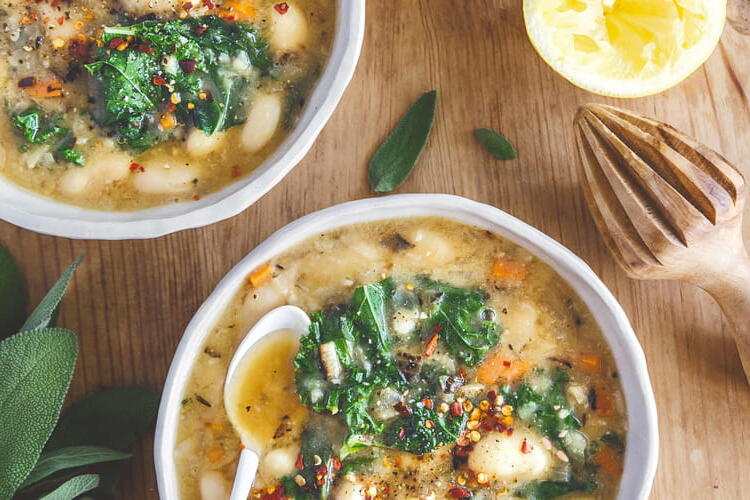 Stir in the garlic and continue cooking for 1 minute. Add the rinsed and drained white beans, mix, then cover everything with vegetable broth. Bring to a boil, then lower the heat.