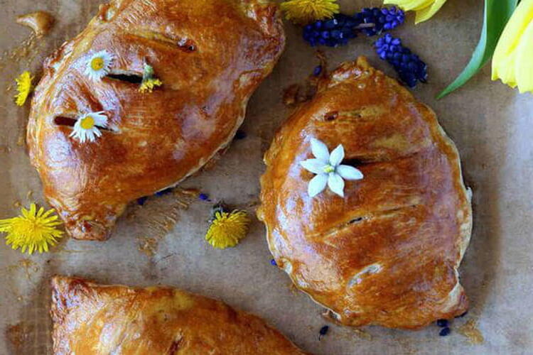 Cut 4 circles from the puff pastry. Place an apple on one half of each circle. Add a spoonful of rose jam to each apple. Moisten the edges of the pastry and fold in half, sealing the edges to form a half-moon shape.