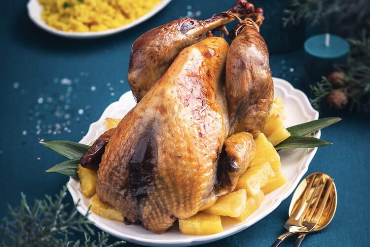 A delicious festive and exotic recipe for roasted guinea fowl with pineapple and amber rum, perfect for the Christmas holidays!