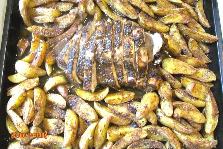 Lower the oven temperature to 200°C and place the meat with the potatoes inside. Cook for about 45-50 minutes or until the meat is nicely browned.