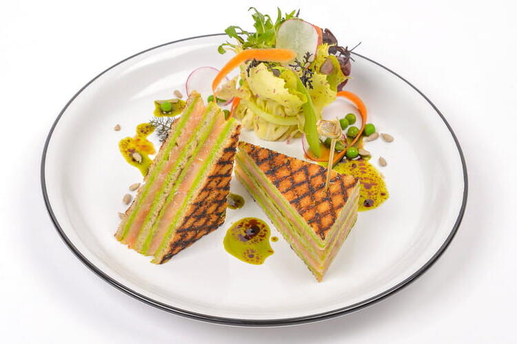 Layering: Stack the clubs: 3 layers of bread, 4 layers of pea puree, 2 layers of salmon. Chill before cutting into triangles with a skewer. Make salad bouquets with mixed greens and fresh herbs.