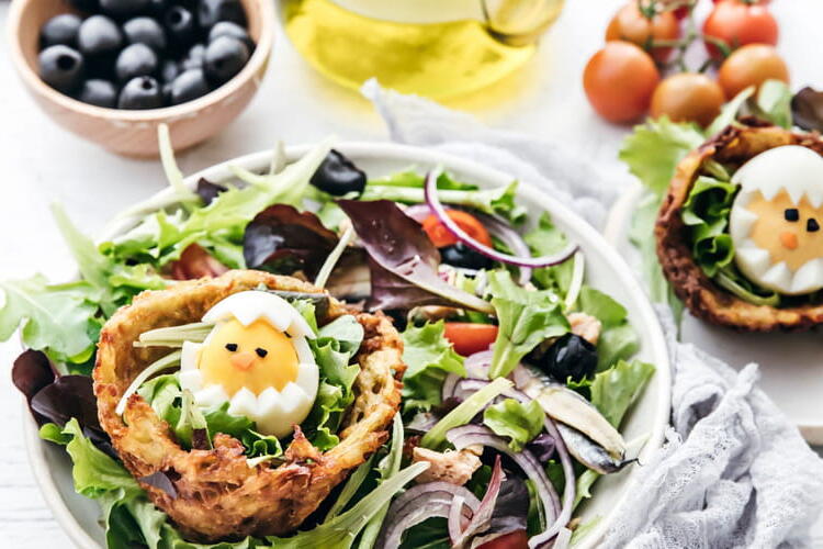 To finish, plating the waffles: Cut the waffles in half and place them on the serving plate, offsetting them. Add a little whipped cream. Slice the salmon, roll the slices, and place them partially on the whipped cream and the waffle. Add eggs to the ends of the salmon rolls. Arrange the salad leaves and beetroot nicely. Drizzle a few drops of vinegar around and add small toothpicks. Just before serving, add a drizzle of lemon over the half waffles.