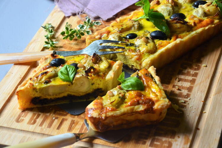 This savory tart is one of my favorites! It can be prepared all year round thanks to canned goods: artichoke hearts, black olives, and anchovies! This tart is made with a homemade crust, onto which a quiche filling is poured. Very delicious, it can be enjoyed as a starter, hot or cold, or as a main dish accompanied by a green salad.