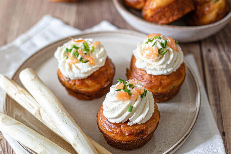 Here is a recipe for savory smoked salmon cupcakes with lemon, mascarpone whipped cream, and white asparagus, perfect for an appetizer or a starter. This recipe made with white asparagus, salmon, mascarpone, lemon, Emmental, and Parmesan is easy to make and will surprise your guests.