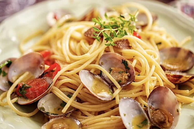 Sauté the squid in the same oil. Sauté the mussels and clams until they are all opened. Add the garlic, and when it is slightly golden, add the tomato.