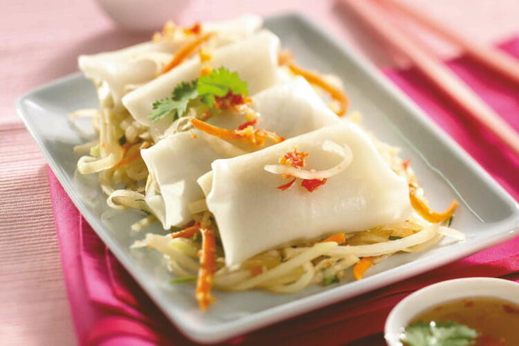 Place a large teaspoon of the mixture on the lower part of the rice wrapper, add a few bean sprouts and 2 leaves of coriander, roll the wrapper once and fold the edges inward, then fully roll the rice wrapper, tucking in the pointed end.