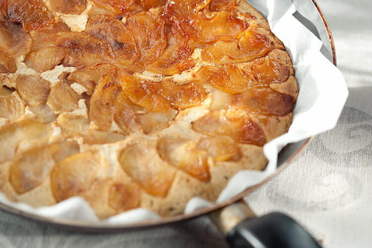 Place a sheet of parchment paper at the bottom of the pan, mark the edge with your nail, and cut out the circle traced. This will make it easier to flip the cake.