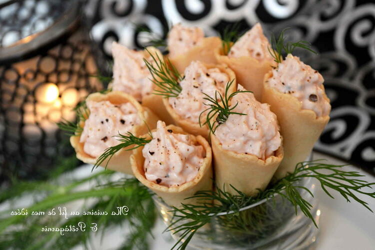 Fill the cones or other appetizers with the mixture using a piping bag. Season with pepper and garnish with dill.