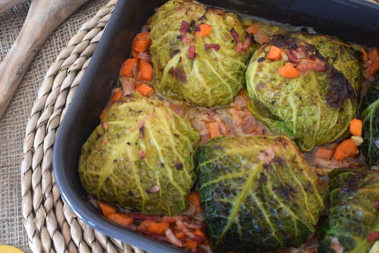 To finish, preheat the oven to 200°C. Place 1/6 of the filling on each cabbage leaf. Fold the leaf over the filling. Do the same for the other 5 leaves. Place the parcels in a baking dish. Pour the sautéed shallots, carrots, and bacon over them. Add the two containers of onion and bacon cooking juice, the white wine, and a little water if necessary. Bake for about 40 minutes. Serve immediately.