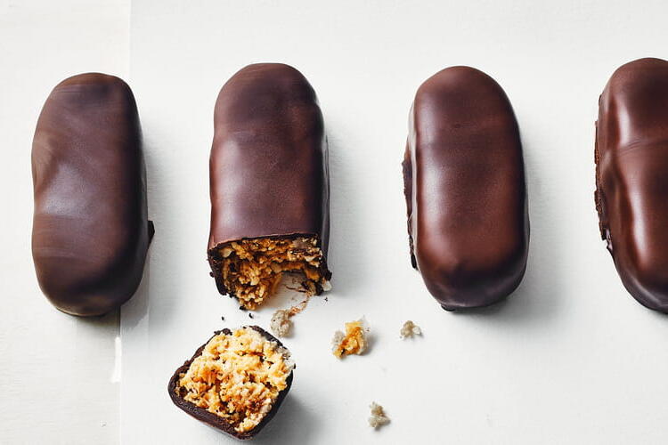 Take the coconut mixture rectangles and dip them in dark chocolate.