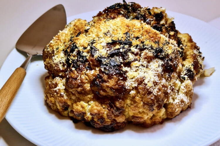 Bake for 45 minutes and brush the cauliflower with the remaining mixture. Sprinkle with breadcrumbs and continue cooking for another 45 minutes. If the cauliflower becomes too dark, cover it with aluminum foil or parchment paper.