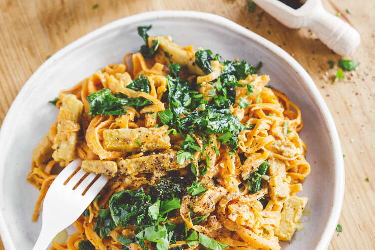 Rinse, then remove the stem and the main veins from the kale leaves. Roughly chop the leaves and add them to a large skillet with the tempeh, sweet potato noodles, and peanut sauce.