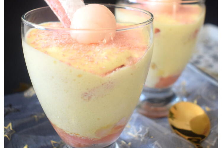 Drain the can of lychees and reserve the juice in a bowl. Keep 6 whole lychees and cut the rest into pieces. Separate the eggs, whip the whites with a pinch of salt. Beat the yolks, add the mascarpone, and mix well. Incorporate the sugar.