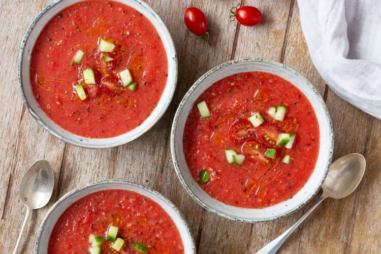 This tomato and bell pepper gazpacho recipe is refreshing and ideal for summer evenings.