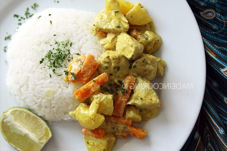 A dish of turkey fillet pieces inspired by Thailand. It simmers gently in a pot to become very tender! Exotic flavors that differ from mushrooms or a whole turkey fillet in the oven. We love it!
