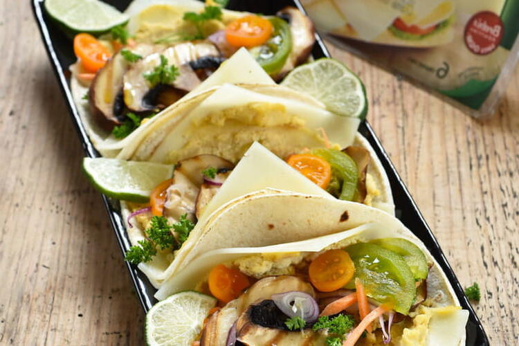 Assemble the wraps by first placing 2 slices of sheep's cheese, then adding chickpea hummus, carrots, red onion, mushroom slices, cherry tomatoes, green tomato, and parsley. You can then roll the wraps and enjoy!