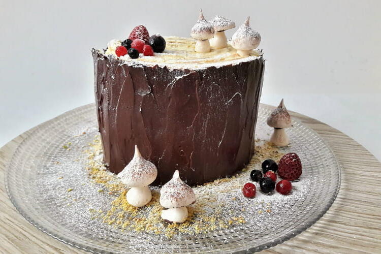 To finish ASSEMBLY!!! Take your biscuit out of the fridge and cut it into three equal strips widthwise. Start by gently rolling one strip, hoping the cream is firm. Then continue by rolling with the second and third strips, pressing the ends together each time. The ganache will also help cover any imperfections 😉 Position your log on a plate and then place it in the fridge for a little while (1 hour or 2 if you have time). If you have an adjustable cake ring (a small one), now is the time to use it to surround the cake while it chills. Otherwise, make a band with thick aluminum foil to hold the biscuit. Remove your biscuit and flip it onto a serving platter for a smooth finish on top. Using a spatula, gradually spread the ganache starting from the bottom and moving upward. Try to create a wood effect! Go around the biscuit several times until there is no ganache left. Place your mushrooms here and there, as well as the red fruits, and sprinkle with crushed pistachios. Dust the whole thing with powdered sugar for a snowy effect 😉