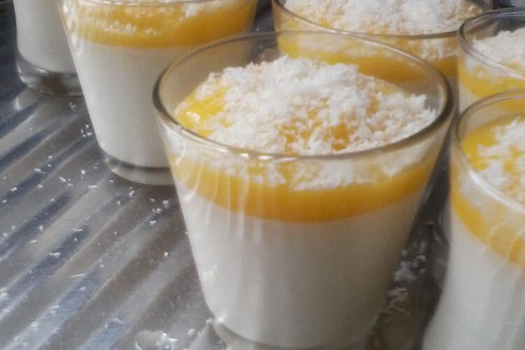 To finish, at the last moment, pour the mango coulis over the panna cotta. You can decorate your glass with grated coconut, for example.