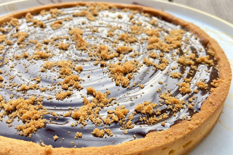 Mix using a blender, being careful to keep it submerged in the liquid to avoid air bubbles. Pour the ganache over the tart crust and sprinkle with the powder collected by grating the tart crust and a little sea salt.