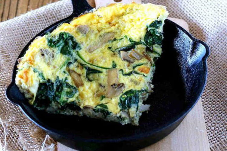 Enjoy this omelette with organic spinach and mushrooms. Slightly golden on the outside, fluffy on the inside, and topped with mushrooms and young organic spinach leaves with herbs.