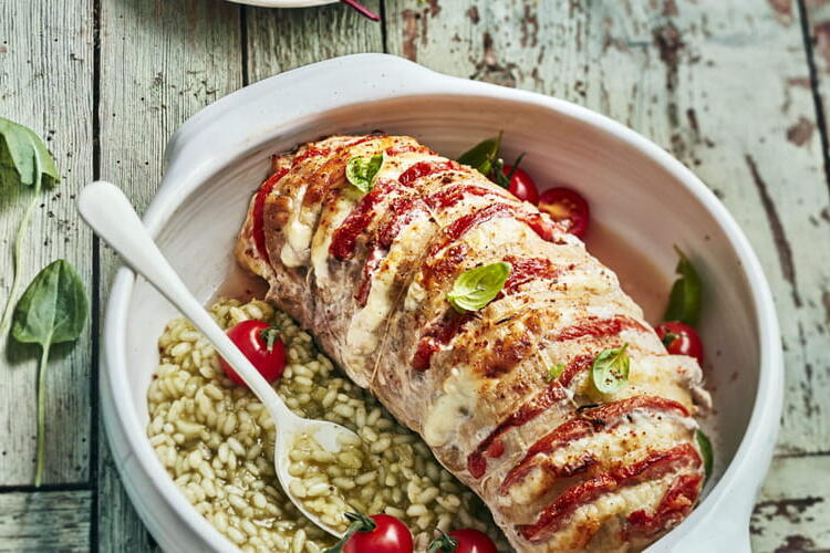 This veal orloff recipe, with tomatoes, mozzarella, and sorrel risotto, is presented by Veal of Pentecost. Photo credit: Veal of Pentecost / Amélie Roche.