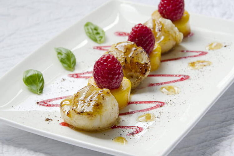 Scallops, mango, raspberries, vanilla, and basil… A very simple recipe but it looks impressive!