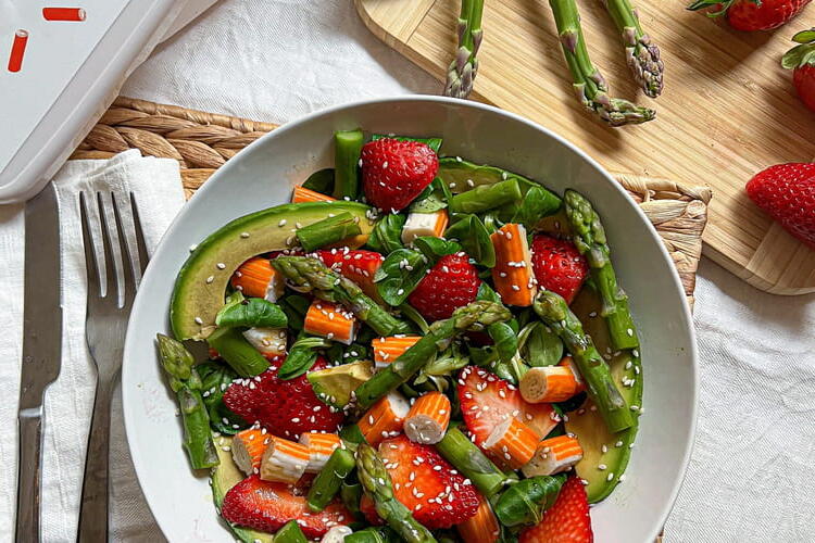 Succumb to this colorful and spring-like dish, rich in nutrients. The sweetness of the strawberries and the crunch of the asparagus will make this salad a meal rich in taste and flavors!