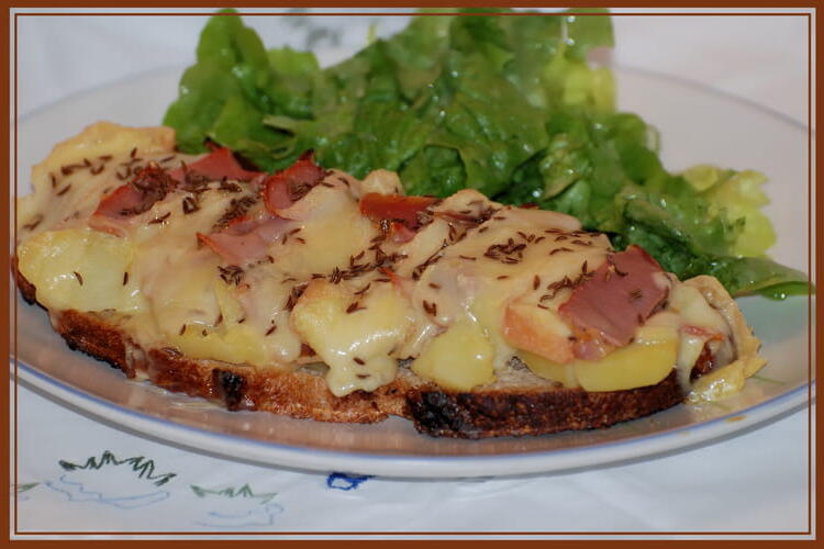 Need a comforting dish with flavors from a specific region? This open-faced sandwich with cheese is perfect for you. Combining creamy and fragrant cheese with the delicacy of cured ham and the sweetness of potatoes, this simple dish will awaken your taste buds. The cumin adds a distinctive touch, while the white wine gently enhances the flavors.