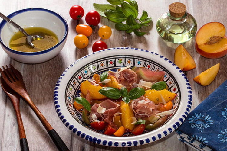 Roasted peach, tomato, and cured ham salad, nothing better to refresh yourself deliciously during this particularly hot summer period when you really don’t want to turn on the oven.