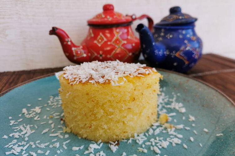 Discover this recipe for semolina cake with honey, soaked in syrup and sprinkled with almonds or coconut.