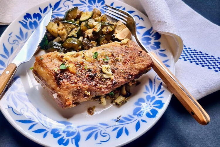 Particularly tasty, pork belly is often too salty because it is drenched in soy sauce. I cooked it slowly and for a long time, simply flavored with subtle, sweet, and fruity chili. Here, it is served with roasted summer vegetables, but you can also choose various roasted winter vegetables to accompany the pork belly.