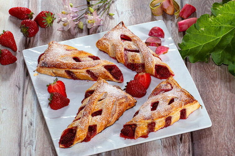 Rhubarb and strawberry turnovers. It’s a combination that I particularly enjoy. The shaping is original.