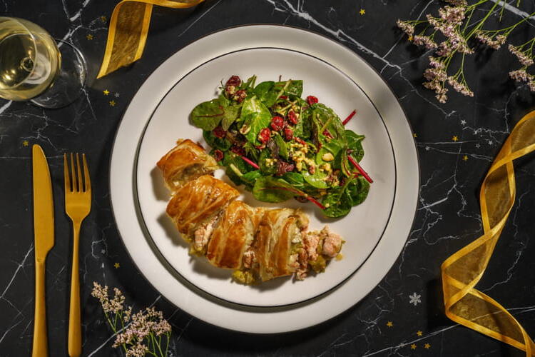 Enjoy this delicious recipe for a braided puff pastry with salmon and leeks, accompanied by a salad with cranberries and cashews. Original, gourmet, and rich in flavors, this recipe will delight the taste buds of your guests.