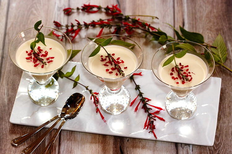 An original and wonderfully fragrant panna cotta that I propose to you. I used the leaves and flowers from a pineapple sage plant in the garden. Delicately flavorful on the palate, I added fresh flowers that are loved by little bees to enhance the taste, and I was absolutely right.