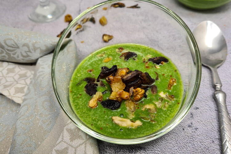 Soups and purees are dishes that can be prepared on a daily basis, but also for more festive occasions. It is very easy to enhance a soup: a few nuts, a bit of granola, a touch of coconut milk for a unique twist. This spinach soup, with its mushrooms and nuts, has a festive touch. For special occasions but not only: why not treat yourself to a delicious and festive dish without any particular reason?