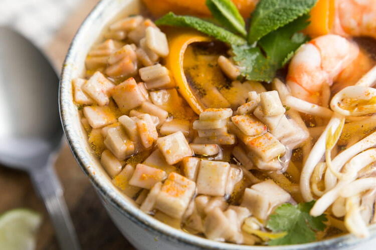 A delicious and comforting recipe for Asian broth with small pasta and shrimp.
