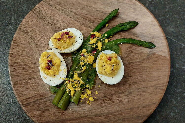 To finish For the plating: Place three asparagus stalks on each plate. Drizzle a "Z" with the vinaigrette over the asparagus. Fill the egg whites with the mayonnaise made from the yolks and arrange three half eggs on each plate. Lightly sprinkle some yolk on the eggs and in the center of the asparagus. Garnish with a few dried flower petals to add a touch of color. Serve the remaining mayonnaise and vinaigrette in bowls, should your guests wish to add more.