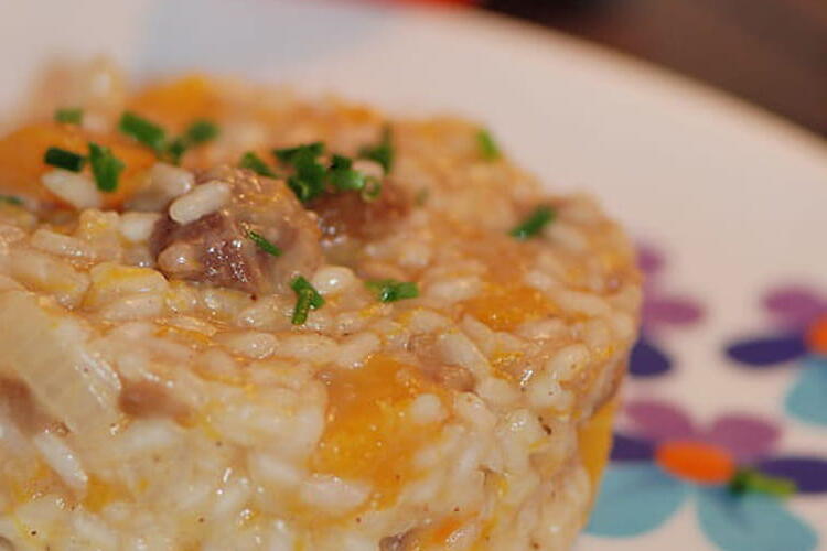 Peel and slice the onion. Chop the chestnuts and set aside. Sauté the sliced onion and butternut squash cubes in olive oil in a pot. Add the rice, stirring constantly until the grains become translucent.