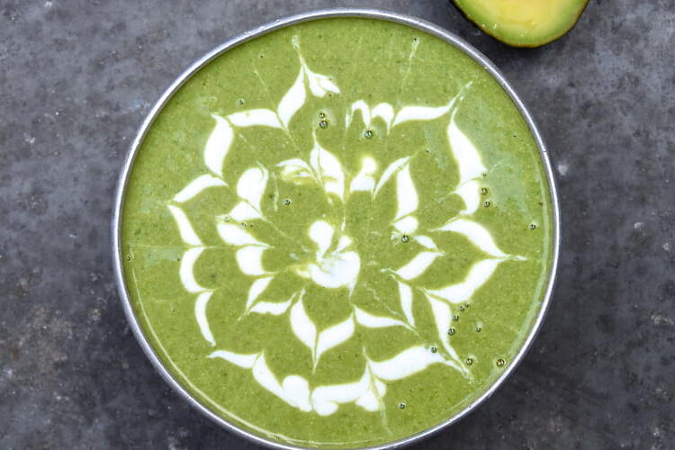 To finish, using a small spoon, place a dollop of yogurt in the center of each bowl filled with soup, then carefully drizzle it with 2 or 3 concentric circles. Use a skewer to form your star by dragging the tip of the skewer from the center point towards the edge of the bowl, crossing through the circles of yogurt. For the next line, start at the edge of the bowl and move back towards the center. Alternate directions at regular intervals until you achieve a pattern you like. You can make it spicier by using hot sauce instead.