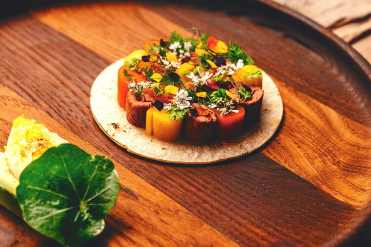 To finish, PLATING: Place the taco on a flat plate or a rectangular wooden board. Add some piperade to the center of the taco and then top it with the veal stew. Fold the taco and serve hot.
