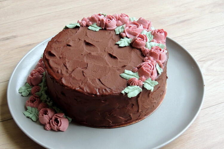 White chocolate flower ganache: Use a Russian piping tip of your choice. Prepare the day before. Bring the liquid cream to a boil, and melt the chocolate in a double boiler. Incorporate the cream in three additions while whisking, similar to making mayonnaise. Finally, fold in the blackberry purée. Place this ganache in the refrigerator until the next day and whip it like you would for whipped cream; it will thicken and become airy. Transfer it to a piping bag fitted with the chosen tip. Decorate your cake.
