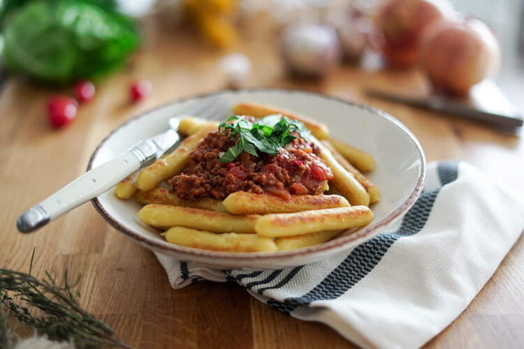 To finish, adjust the seasoning of your bolognese if needed and serve with pan-fried gnocchi!