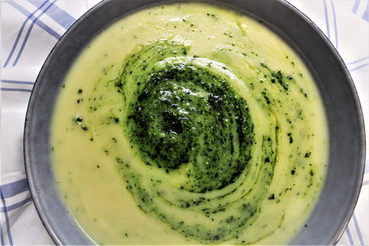 Cauliflower velouté with kale pesto (made in a cooking robot). The kale pesto adds flavor and strength to the cauliflower, which is rather mild.