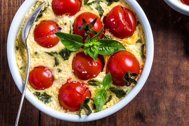 A recipe for cherry tomato clafoutis, suggested and photographed for cooking with a steamer.