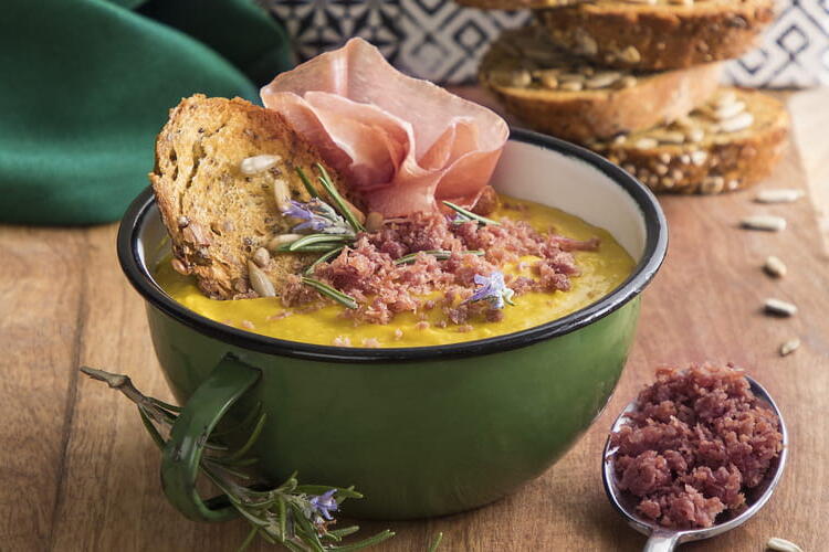 Discover the recipe for chickpea cream soup with turmeric, sunflower seed croutons, and ham. Comforting and original, this easy-to-prepare recipe will delight your taste buds.